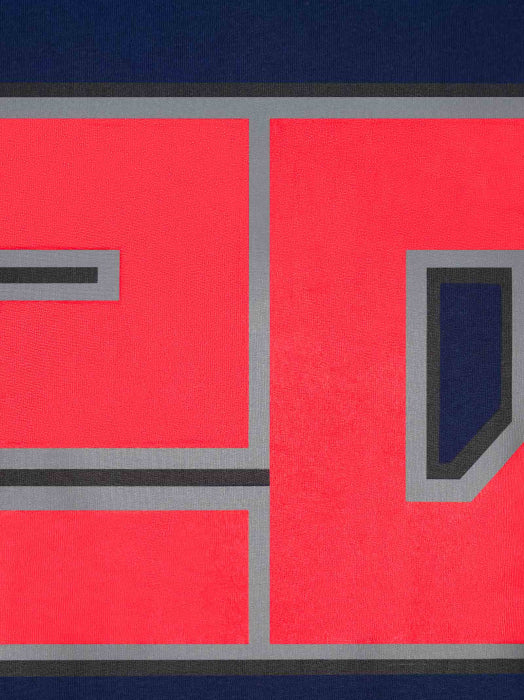 - Features striking red accents on the sleeves, complementing the dark black base.